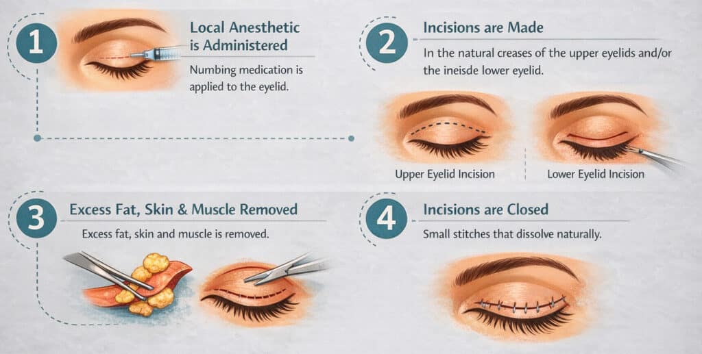 • Incisions are made in the natural creases of the upper eyelids and/or the inside lower eyelid